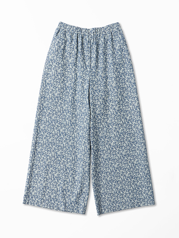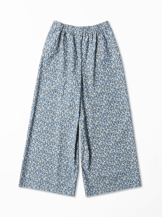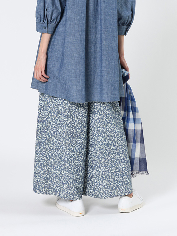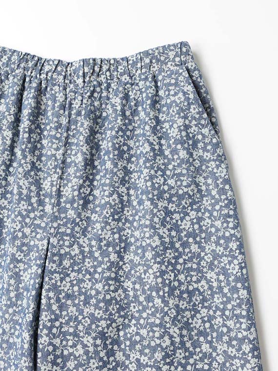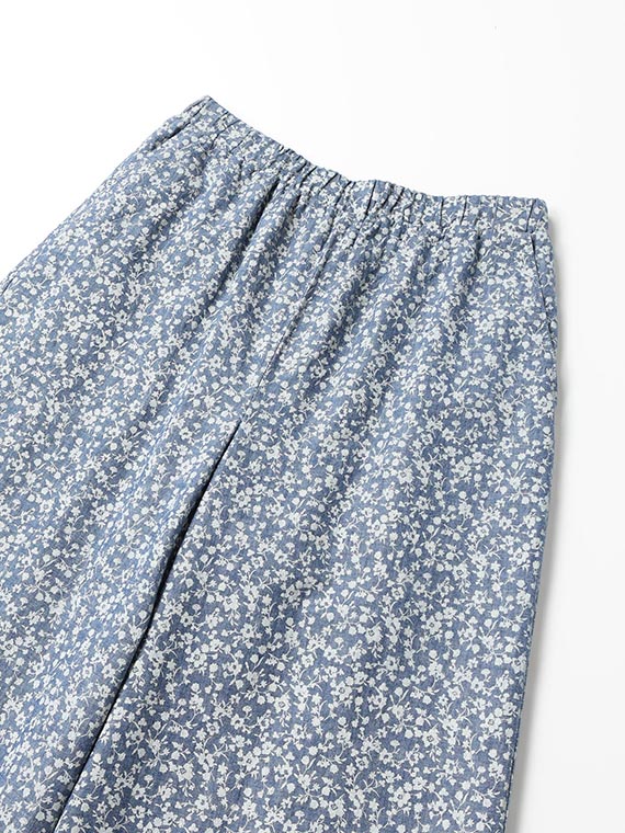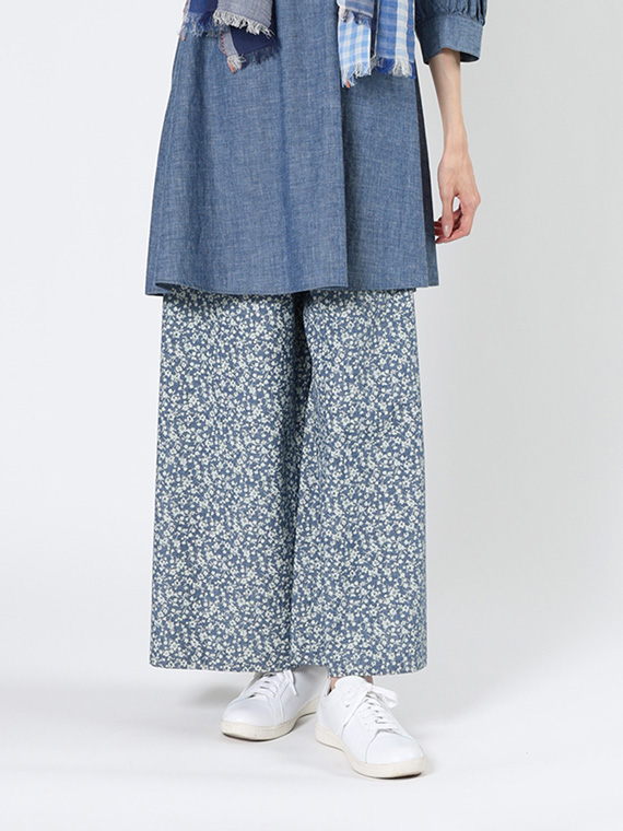 シャンブレー デニム プチフラワー プリント ワイドパンツ