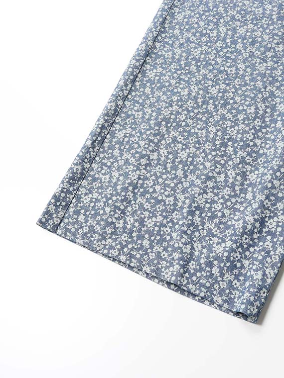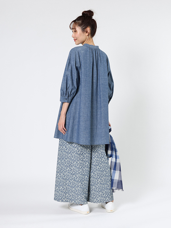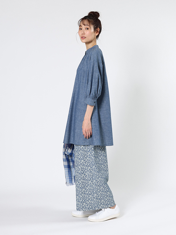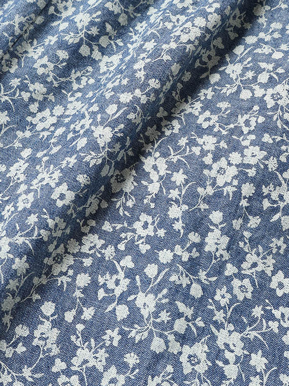 シャンブレー調の奥行きのある生地に、顔料で繊細な小花柄をプリントし、さらに製品洗いをかけることで、こなれた質感に仕上げました。