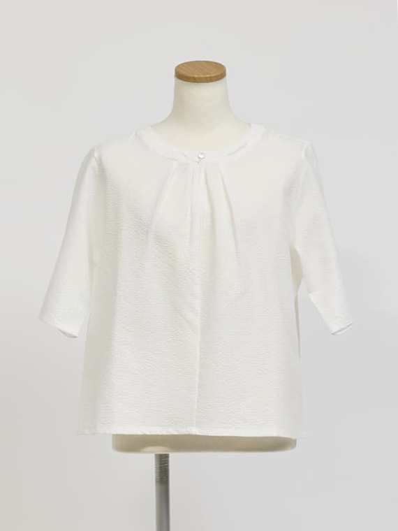 凹凸のある生地感で肌離れがよく、暑い時期にも快適に着用できます。衿ぐりはヨーク切替にし、前中心に1つ釦を配したさりげないデザインポイントに。左衿ぐりにはロゴ刺繍を入れ、控えめなアクセントを添えました。5分袖で一枚でも着やすく、デイリーに活躍するアイテムです。