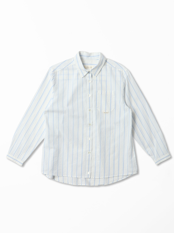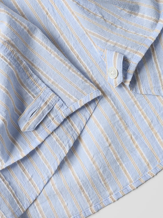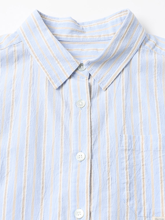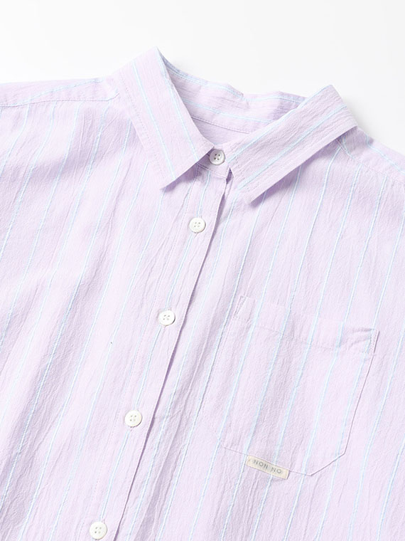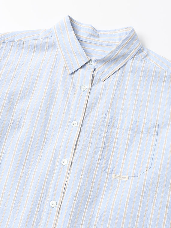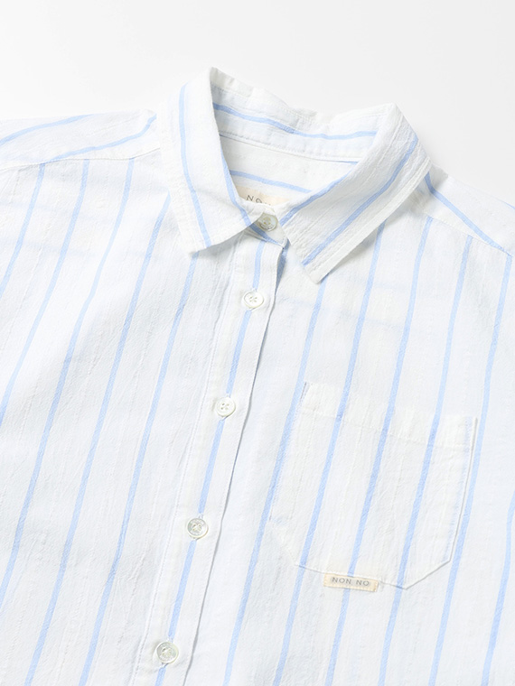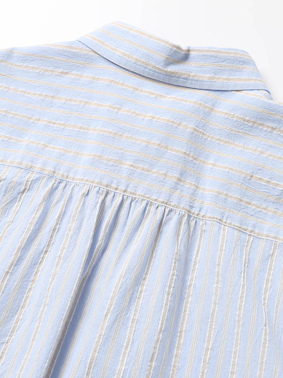 タテ糸は50/1コットンをベースにドビー部分には80/2、ヨコ糸には50/1コットンボイルを配置したドビーストライプです。それぞれの柄にレースのようなドビー組織を組み合わせました。ヨコ糸に強撚のボイル糸を配置することと仕上げ加工との融合で、凹凸感のある独特なシワ感と肌離れの良い風合いに仕上がっています。