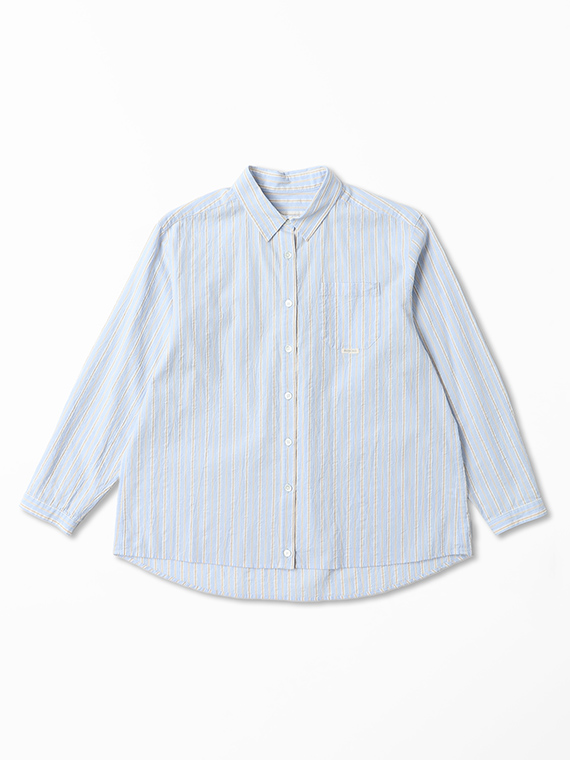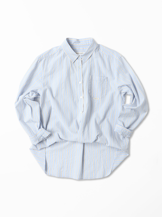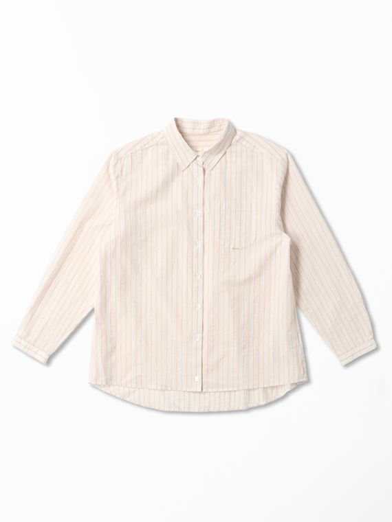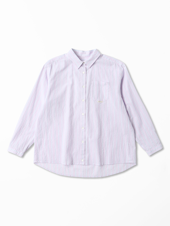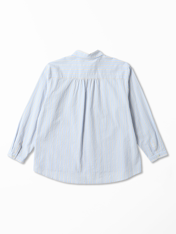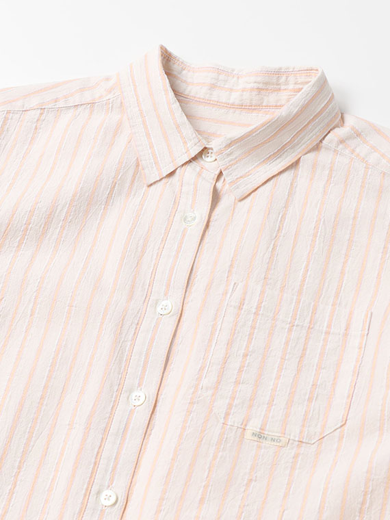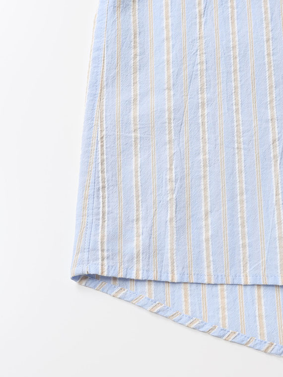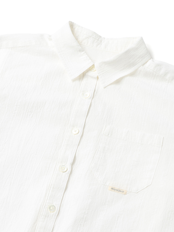 タテ糸は50/1コットンをベースにドビー部分には80/2、ヨコ糸には50/1コットンボイルを配置したドビーストライプです。それぞれの柄にレースのようなドビー組織を組み合わせました。ヨコ糸に強撚のボイル糸を配置することと仕上げ加工との融合で、凹凸感のある独特なシワ感と肌離れの良い風合いに仕上がっています。