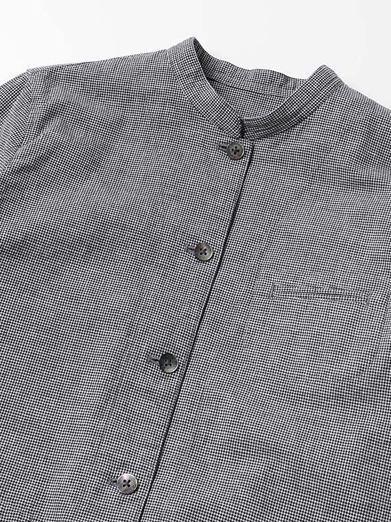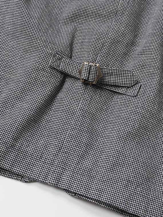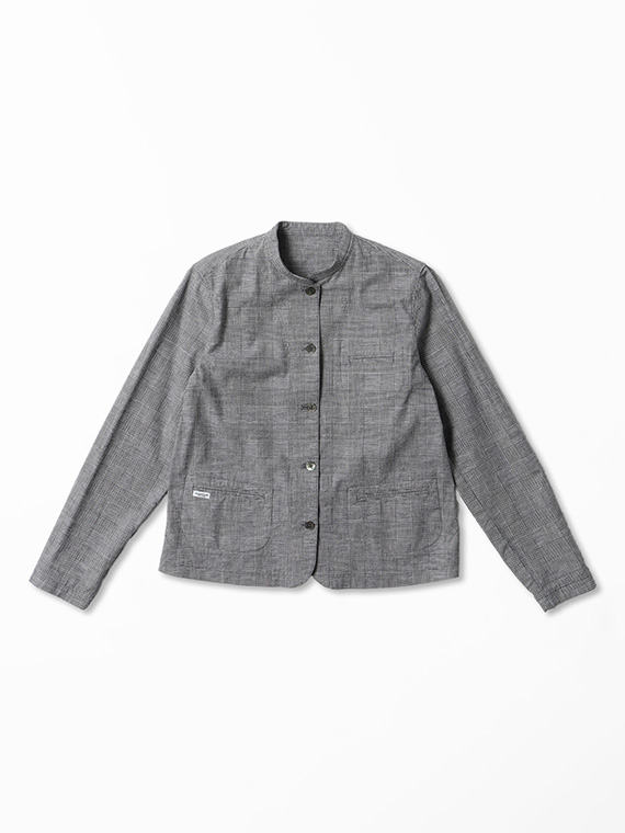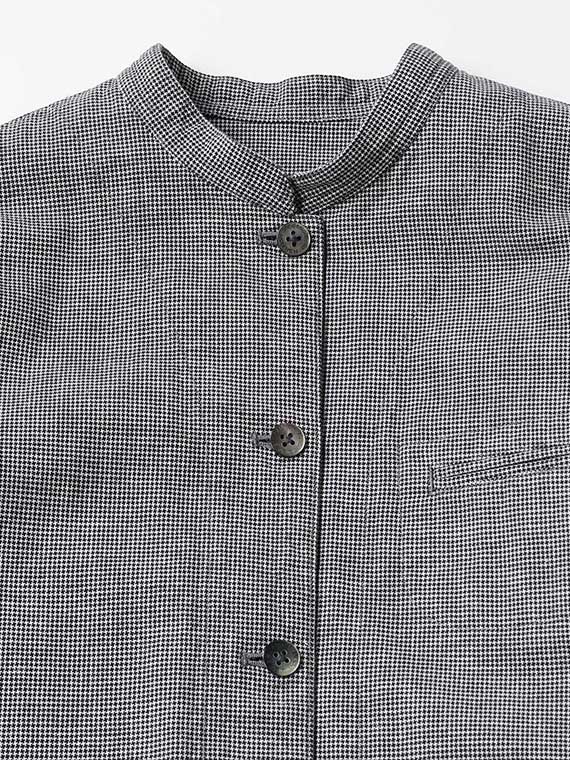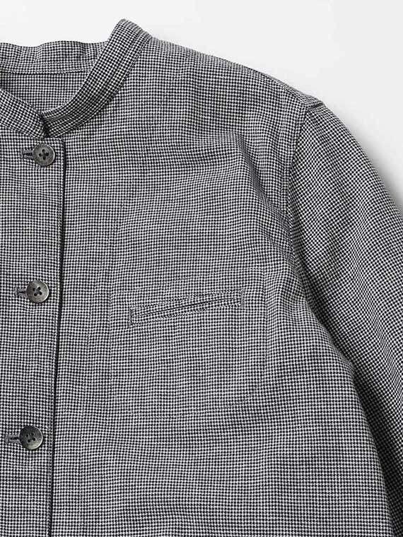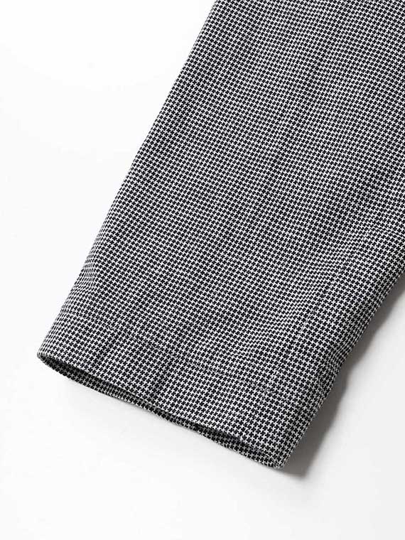 タテ糸・ヨコ糸に12/1綿セミコーマ糸と16/1綿麻を使用したアウター用チェック素材です。12/1綿を黒に染めて綿/麻を普通晒に仕上げて柄を表現しました。①千鳥、②ギンガムチェック、③グレンチェックです。ソフト樹脂を使用して、しなやかな麻の粗野感が楽しめる素材となりました。