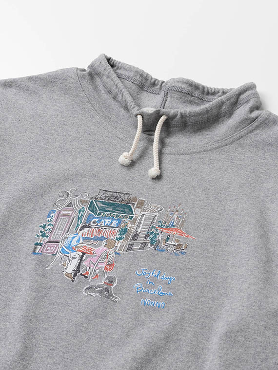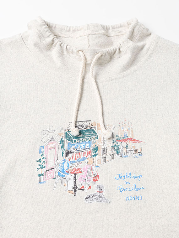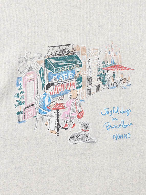 〈In Barcelona〉をテーマに、2026年のガウディ没後100年に想いを込め、サグラダ・ファミリアを遠くに望むカフェの風景をクレヨンタッチで表現。