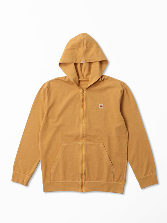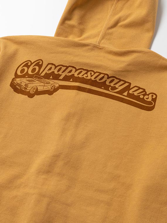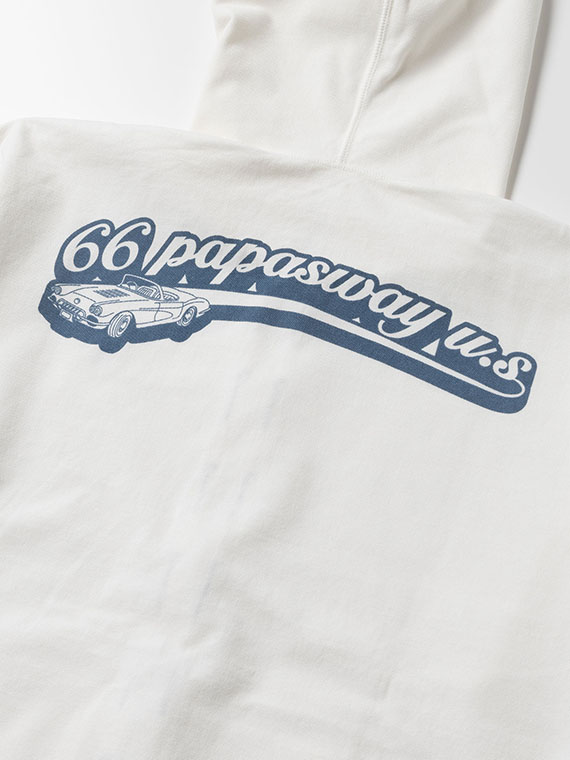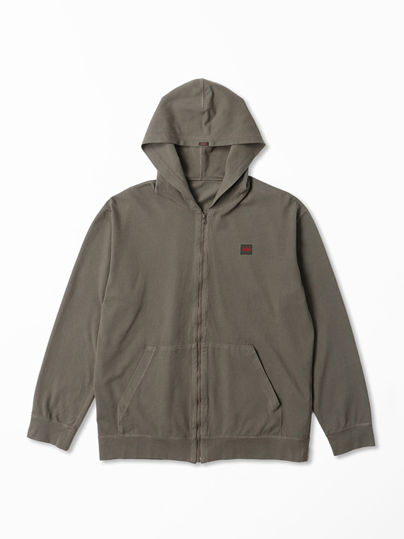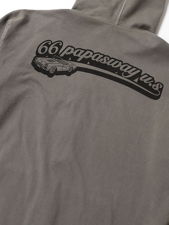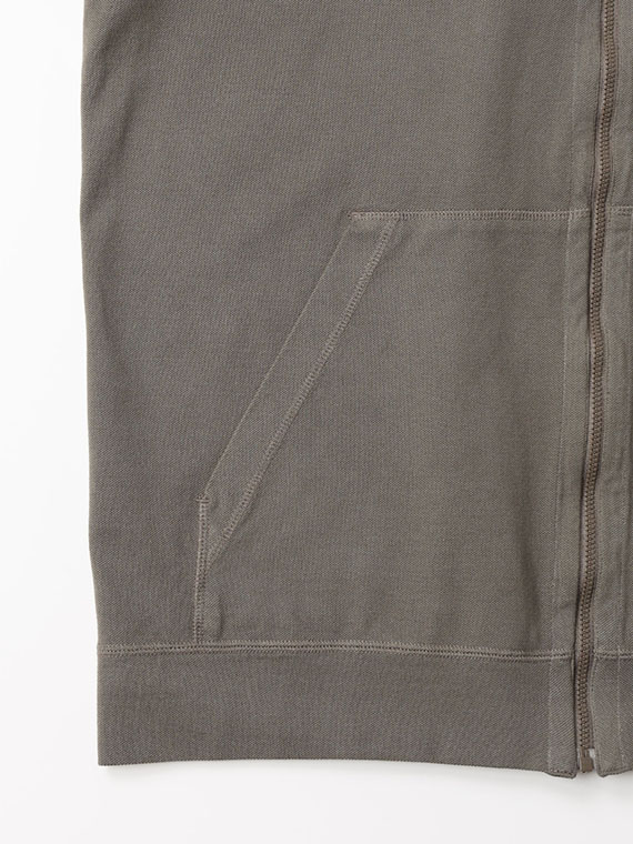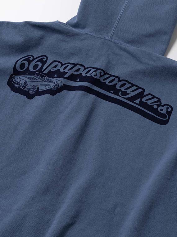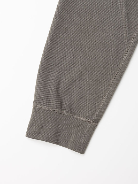 素材には50/2鹿の子生地を用い、製品の状態で中白染め加工を施しています。中白染めはカチオン化した生地に綿の反応染め&洗いを施す染色方法です。生地に洗いと染色を行うことで、表面に自然なムラ感とほどよいあたりを生み出すのが特徴です。洗濯を重ねるごとに、少しずつ変化する色合いも楽しめ、長く着るほどに味わいが深まります。また、プリントの上から製品染めを行っているため、色なじみが良く、落ち着いた雰囲気のヴィンテージライクな仕上がりとなっています。