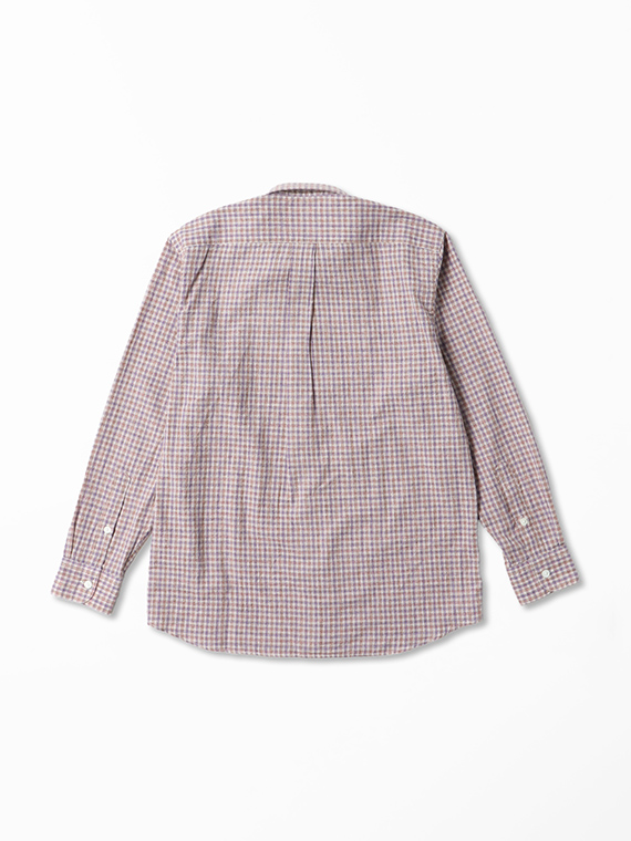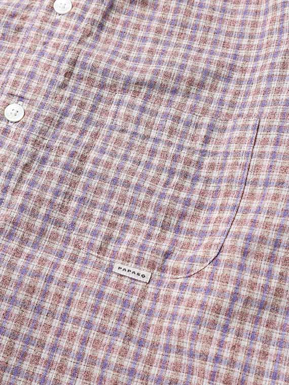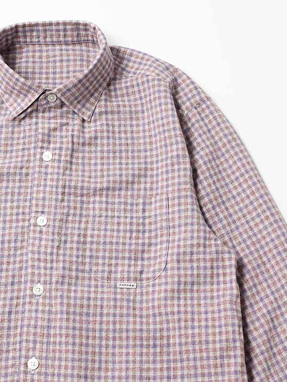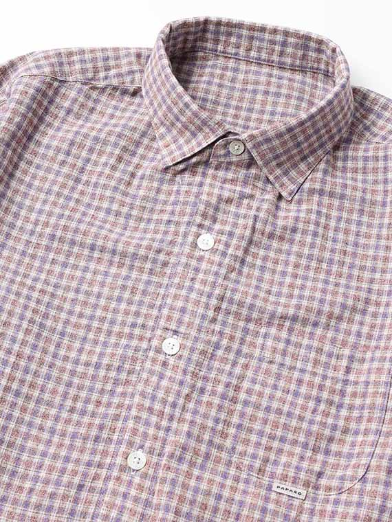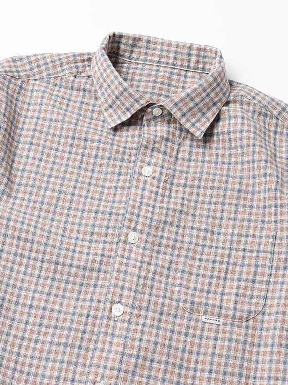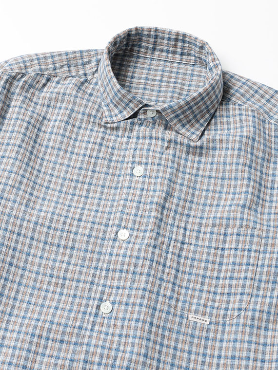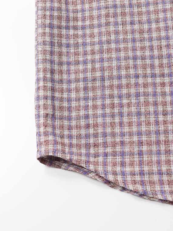 素材は、タテ・ヨコ糸ともに30/1の綿麻混紡糸を使用した平織チェック素材です。糸をスペック染め(ムラ染め)することで、トップ調の奥行きある色合いを表現しています。仕上げにエアーワッシャー加工を施し、ナチュラルでやさしい風合いと肌触りの良さを引き出しました。